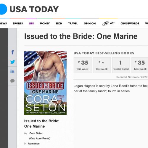 I'm thrilled to announce that Issued to the Bride: One Marine debuted at #35 on the USA Today bestseller list. A special thanks to all my readers who helped make this release a success! Issued to the Bride: One Marine was a joy to write, because I absolutely adored both Logan Hughes and Lena Reed. They are fierce, funny, loving, loyal and a little wacky—the…